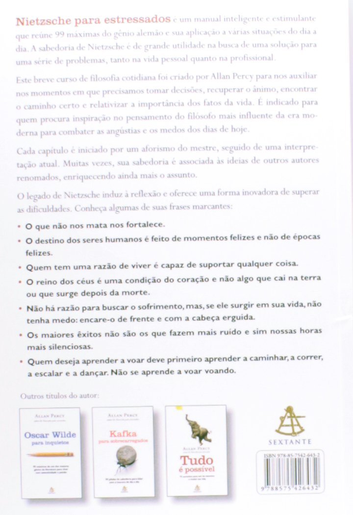 Em “Nietzsche para Estressados”, o escritor e filósofo Allan Percy transforma o pensamento provocador de Friedrich Nietzsche em 99 lições curtas, acessíveis e profundamente inspiradoras para quem busca clareza mental, equilíbrio emocional e força interior. O livro é um verdadeiro antídoto para o ritmo acelerado da vida moderna, ajudando o leitor a lidar com preocupações, frustrações e pressões diárias com uma nova perspectiva — a da sabedoria filosófica aplicada à vida real.