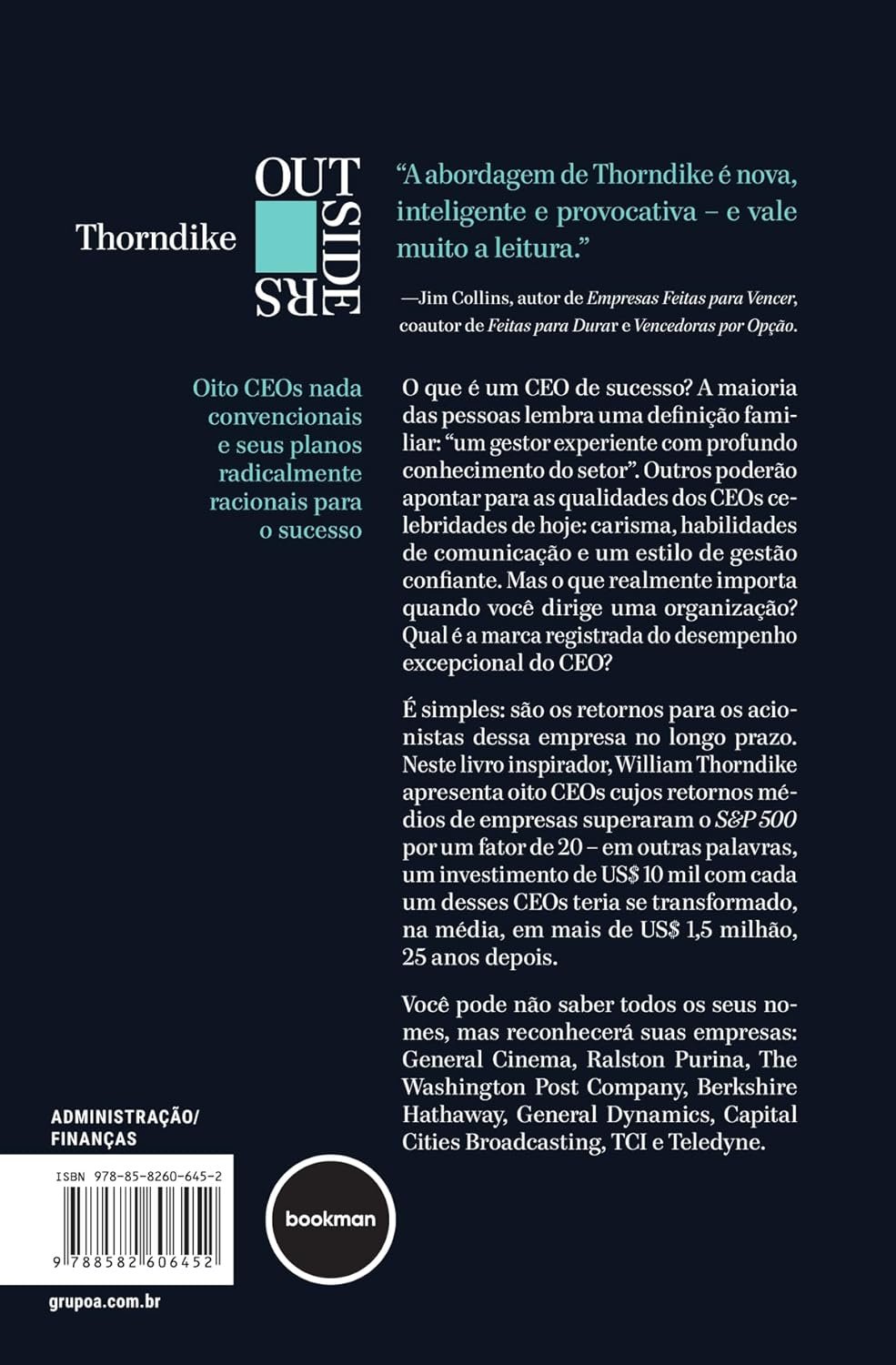 Em Outsiders: Oito CEOs Nada Convencionais, William N. Thorndike traça o perfil de executivos que fugiram do glamour da mídia e das fórmulas tradicionais para entregar os melhores retornos do mercado, superando até mesmo ícones como Jack Welch.