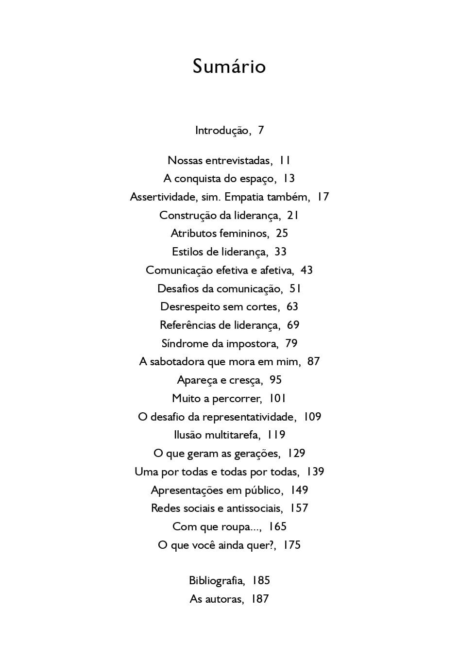 Ao longo dos capítulos, a autora propõe reflexões e estratégias para que mulheres lidem com os desafios diários de se posicionar, liderar equipes, tomar decisões difíceis e comunicar suas ideias com firmeza.