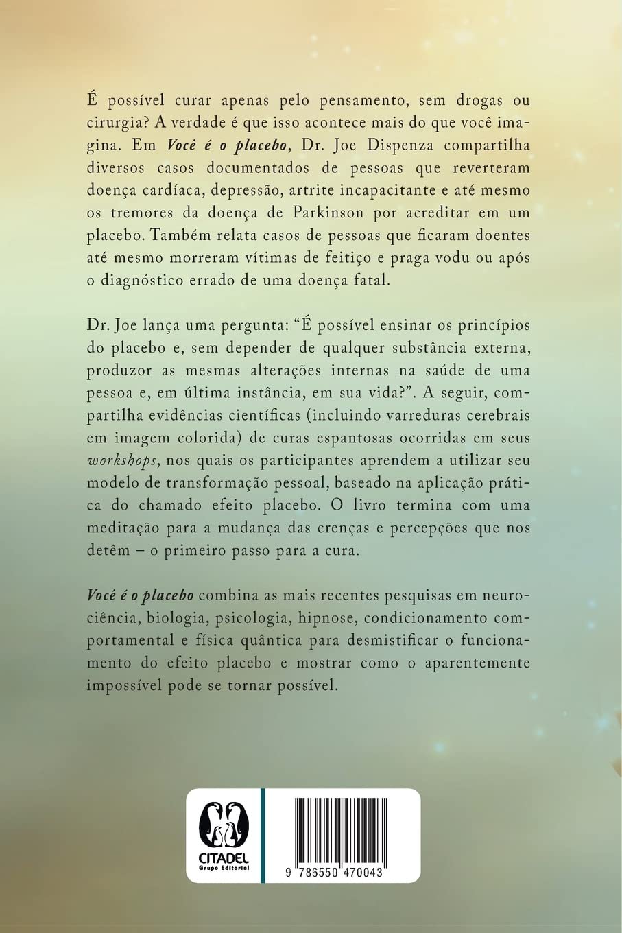Em Você é o Placebo: o Poder de Curar a Si Mesmo, o renomado neurocientista, palestrante e autor Joe Dispenza propõe uma reflexão transformadora: e se o segredo para curar seu corpo, mudar seus padrões e criar uma nova realidade estiver na sua própria mente? Esta obra revela, com base científica e exemplos reais, que o poder da mente humana vai muito além do que fomos ensinados a acreditar — e que cada pensamento tem o potencial de alterar a química do corpo, o estado emocional e até a estrutura do cérebro.